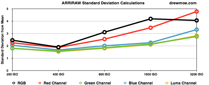 ARRIRAW at 200 ISO Testing Methods![]() Archived below is a series of test images of an MSCCC Color Checker Classic color chart, an 18% Grey Card, and a Neat Video Noise Profile Target. The charts have been shot with flat, soft lighting. Exposure and white balance have been normalized. The charts have been shot at various ISO levels, with shutter speed, f-stop, and/or lighting adjusted to bring exposure back to normal. To quantify the noise characteristics of each camera, I've sampled a 200 × 200 pixel portion of out-of-focus 18% grey. I then refer to a histogram of the sample and its standard deviation (SD) from the mean. A perfectly noise-less sample would have an SD of 0, since every pixel would have the same value. This does not account for differences in resolution, however, as the noise within a 200 × 200 pixel sample will constitute a smaller portion of a higher-resolution image versus a lower-resolution image. I also captured a noise calibration target, to be used with the OpenFX Neat Video noise reduction plug-in. I've provided download links to the noise profiles derived from these tests. If you have the plug-in, you can apply the appropriate profile based on your camera and ISO settings to eliminate unwanted noise. You can learn more about the Neat Video plug-in here.